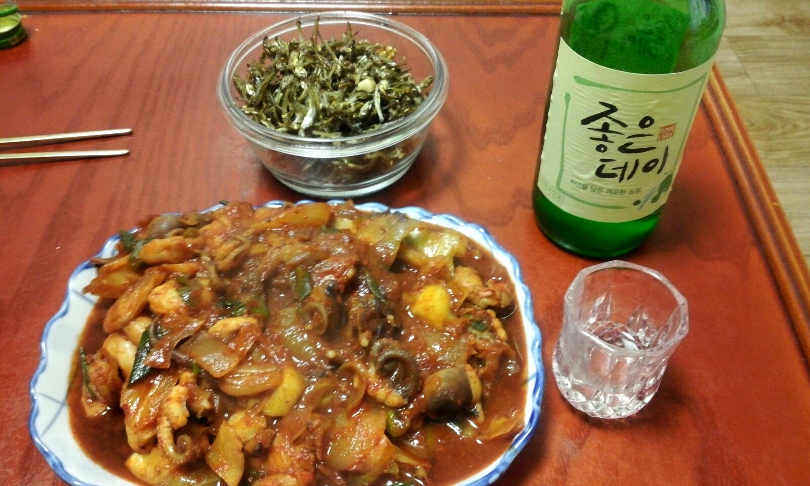 이제. 랑퇴근하고와서. 쭈꾸미 새우볶음해서. 조은데이. 일병해요 ㅎㅎ. 난소맥한잔. ㅋㅋ