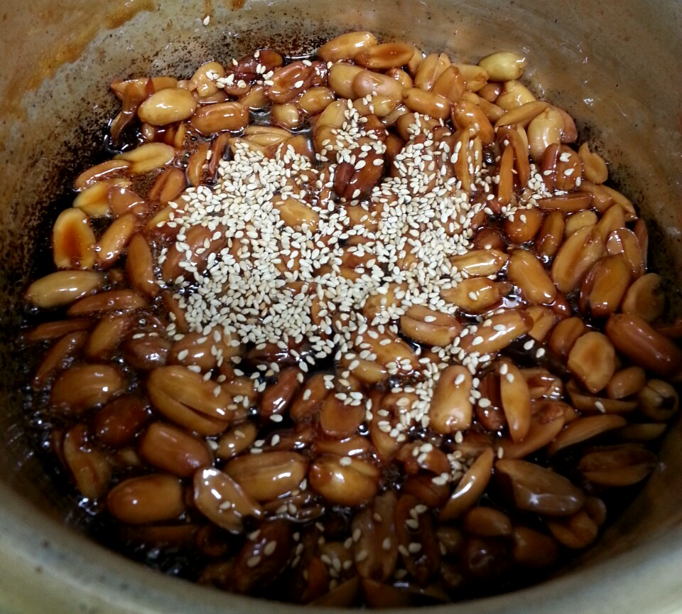 땅콩쌂아서요 물버리구요 한번행구고 물조금만붙구 간장 설탕조금 물엿조금 조리면되욤 마지막에 깨 끝