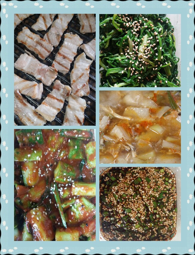 고소한 삼겹이에 오이깍두기, 미나리무침~~ 맛나맛나~