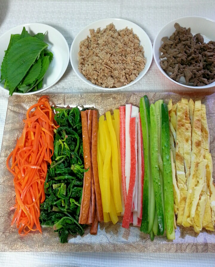 오~럭셔리한 김밥재료가 빵빵. 줄에 5천원씩 받고 팔아도 되겠어요 ㅎ