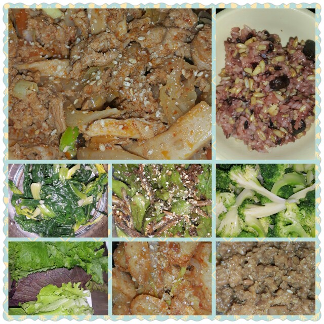 나야네~저녁 밥상은 목살불고기,꽈리고추,브로컬 리,어묵볶음,쌈싸서 요롯케 먹어용~^^♥