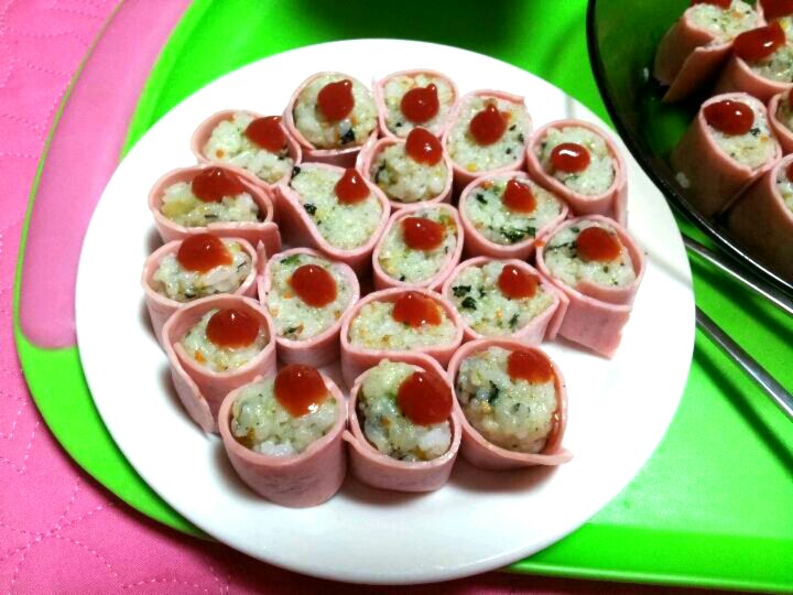 슬라이스햄 데치고 주먹밥에 둘둘 말아 꼭지에 케찹 띡-!!
