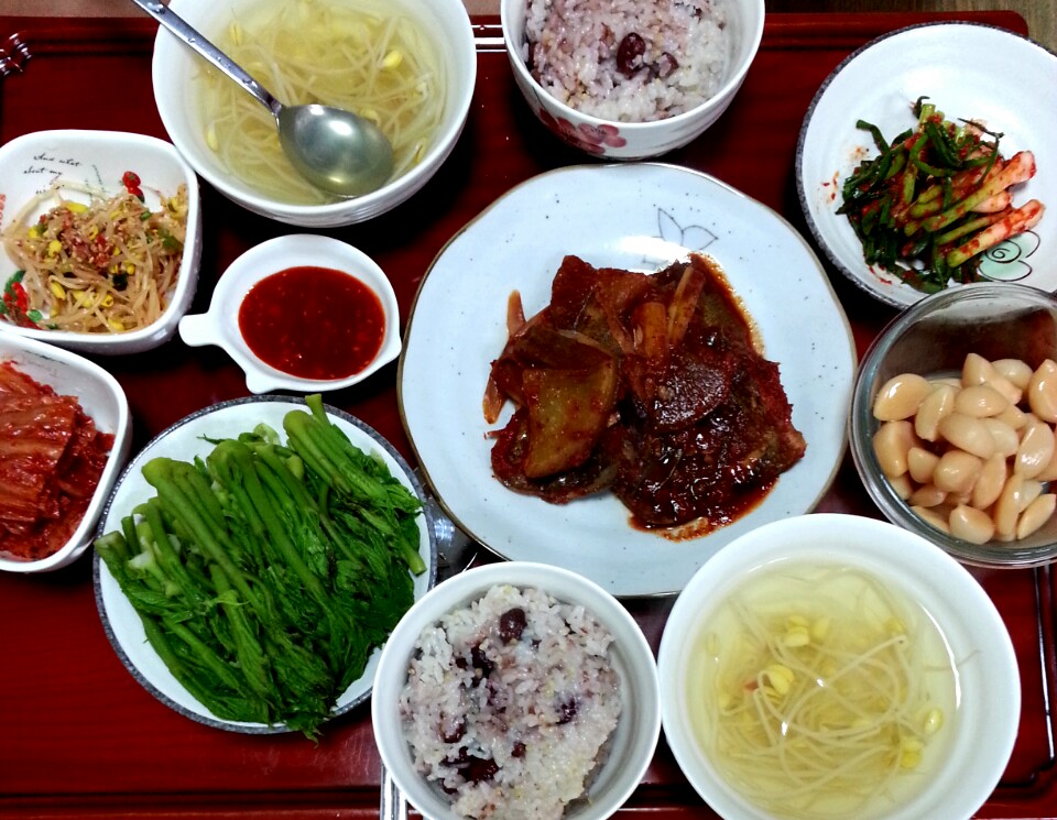 오늘저녁입니당^^오늘장날이라 두릅이랑 서대델꼬왔떠욤^^있던반찬들과 어제끓인 국이랑