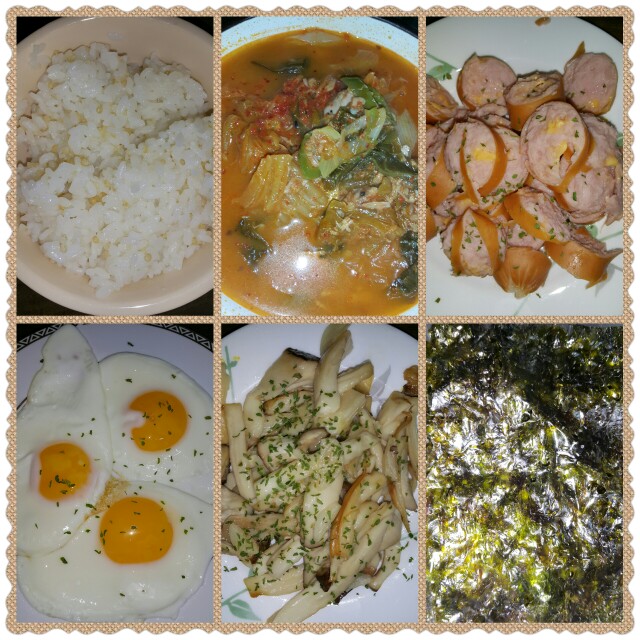 오늘 아침은 퀴노아밥,김치참치찌개,치즈브랏소 시지,계라후라이 반숙.김이랑 요로고롬 먹어용~