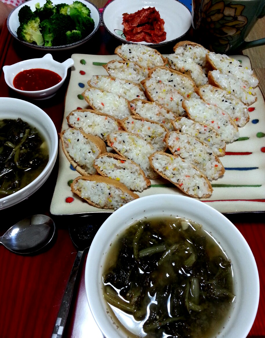 오늘너무피곤해서 대충 시락국끓여 유부초밥대충해서 저녁먹네용 너무피곤하니까 귀찮아서ㅋㅋ 즐거운저녁식사하셔용♡♡