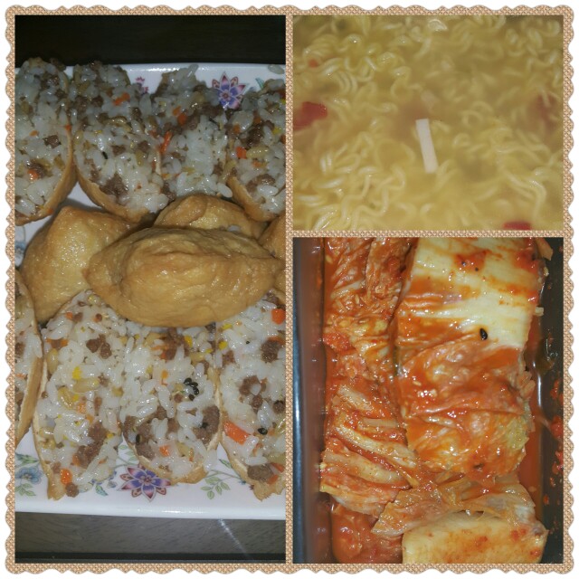 오늘 아침은 소고기 유부초밥+꼬꼬면+김치랑 냠냠해용~^^♥