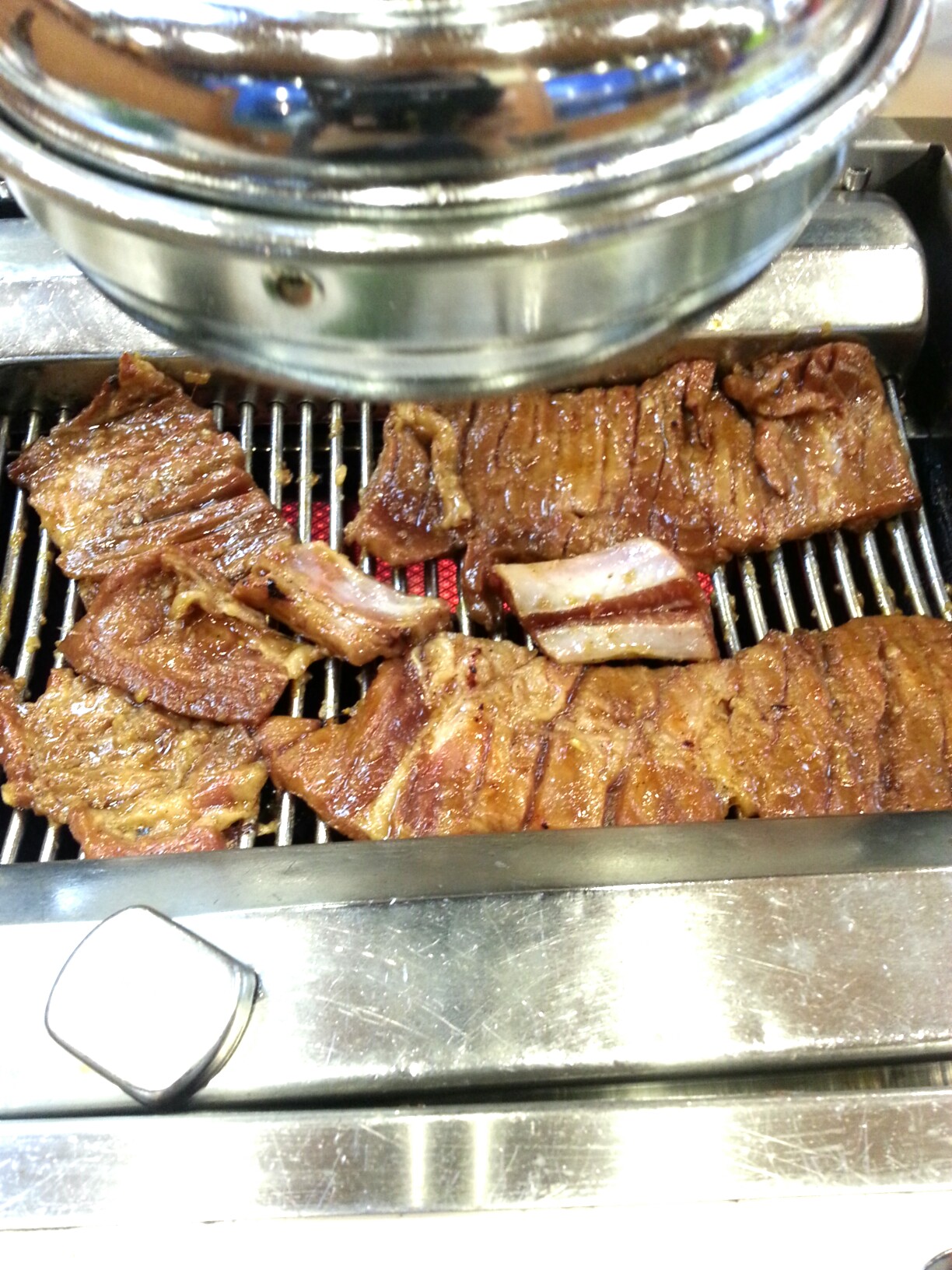 집서 돼지갈비 해묵었는데 이케 불에 구워야 돼지갈빈 맛있엉