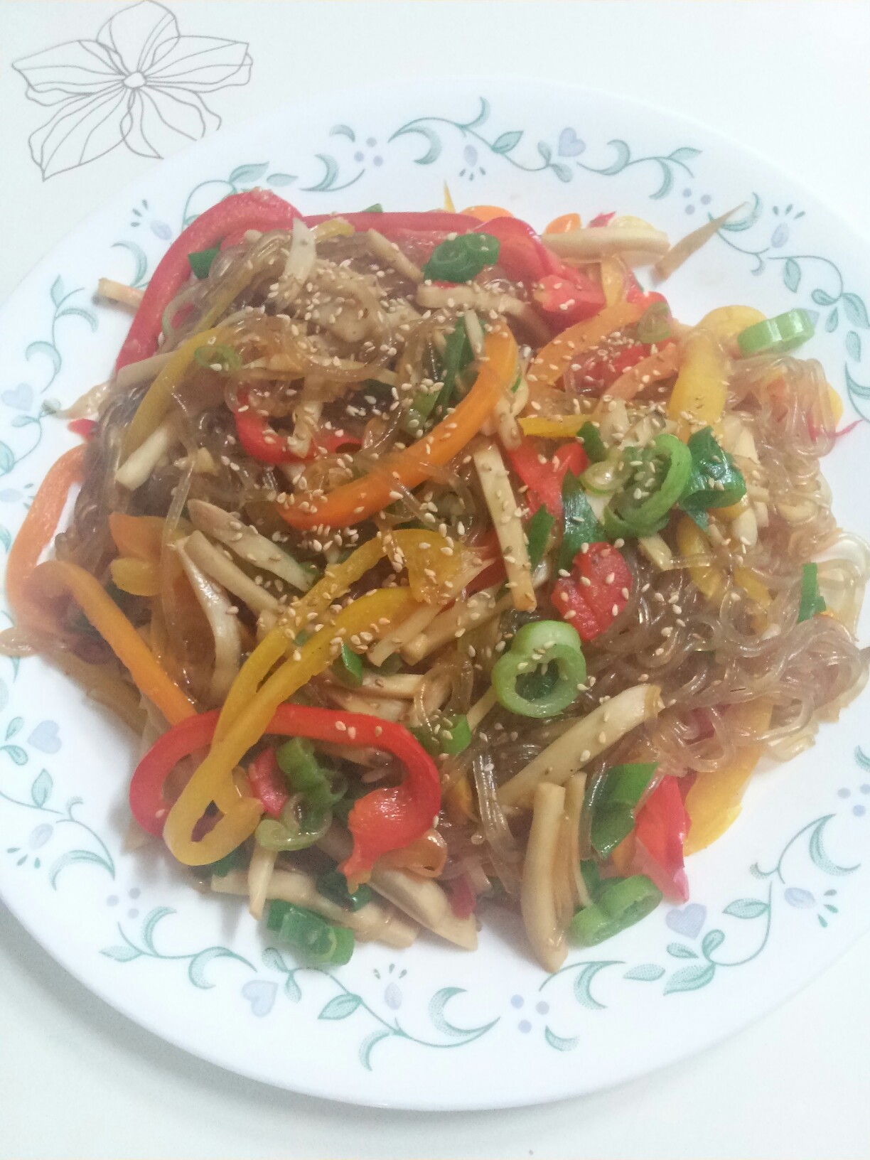 어렵게생각마시구요..전 있는 재료를 이용해서 즉석잡채를 주로해요. 이건 반값 세일하는 새송이와 파프리카를 이용한거구요.