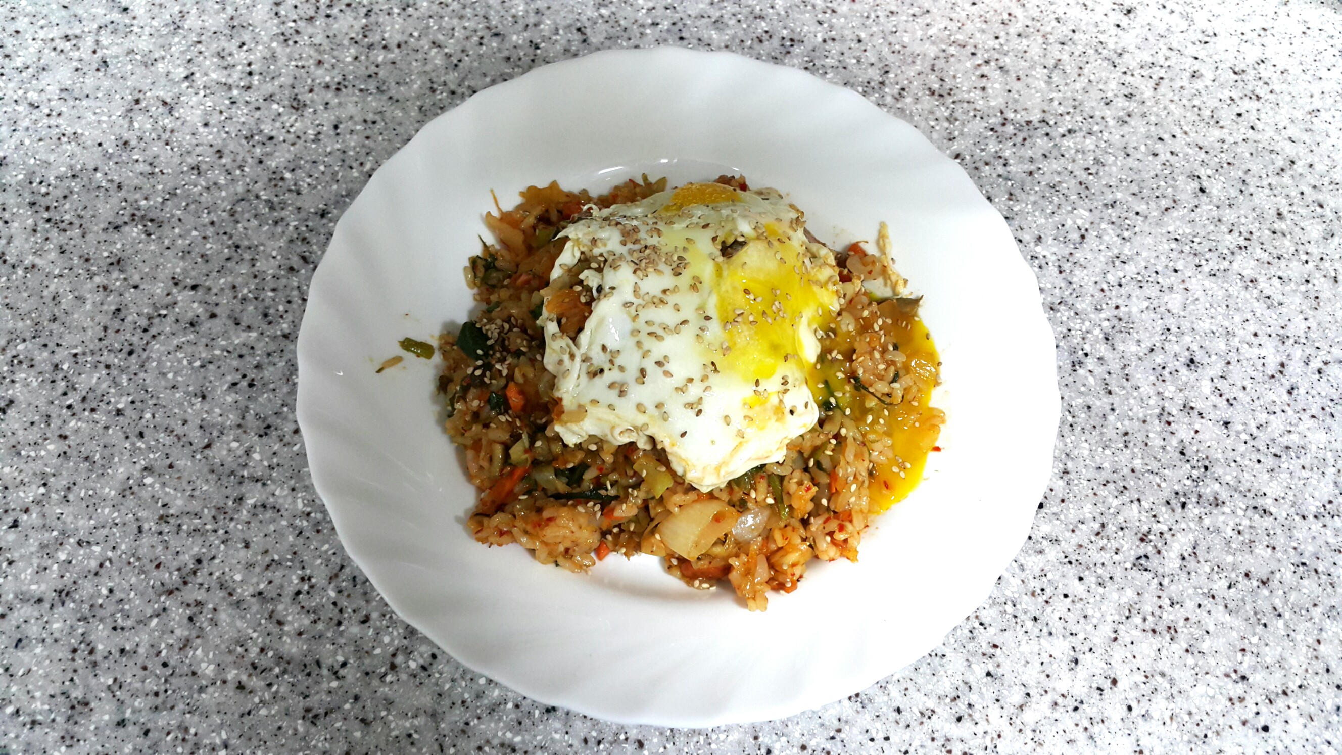 야채김치뽁음밥 야채7종류김치 후라이해서노른자중간 에서흘여내림 안이뻐요. 여친먹고싶다고해서 만들어바서요^^