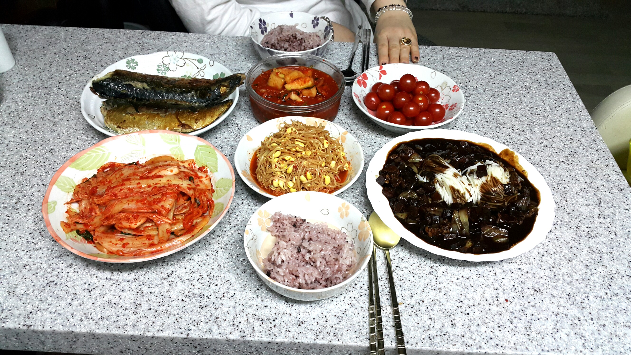 오늘은여친이 고등어 짜장먹고싶다고해서 일하고와서 이제요리끝나네 요 깍두기 김치는 몇칠전 했는거고. 콩나물무침 짜장 고등어 국수는 오늘요리 짜장면 밥으로먹고 후식 방울토마도. 국은 미역국 .사설이길어네요.배고프다. 좋은꿈꾸세요^^