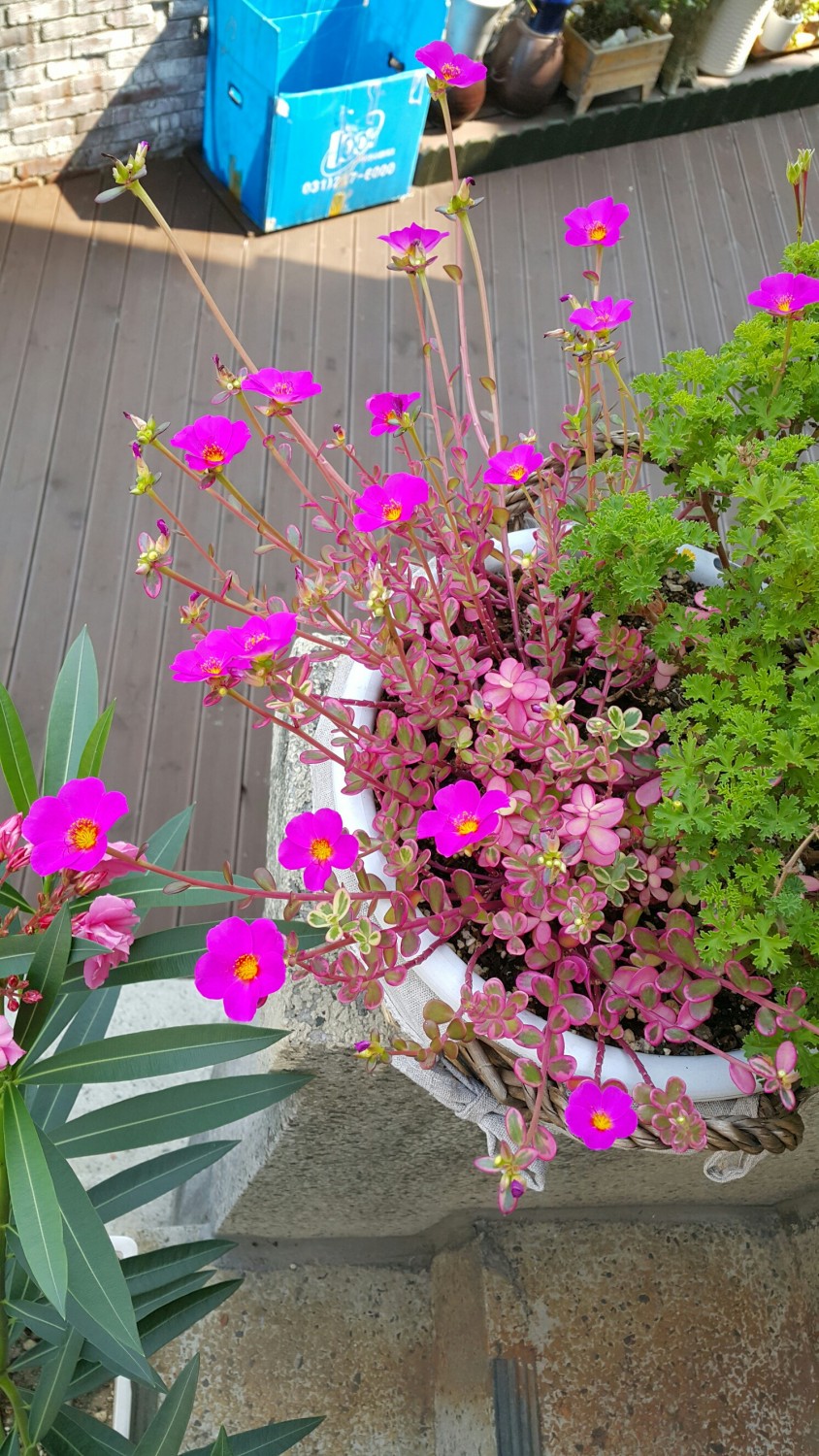 월요병 없으시길 바라는 마음에 숙마님 마당에 만개한 꽃들이 인사드려요ㅎㅎ남의 집 담넘어로 가지 꺾어서 훔쳐온 유두화가 뿌리내리더니 올해는 이렇게 이쁜꽃을 피워주네요~(도둑이라고 신고하기 없기)