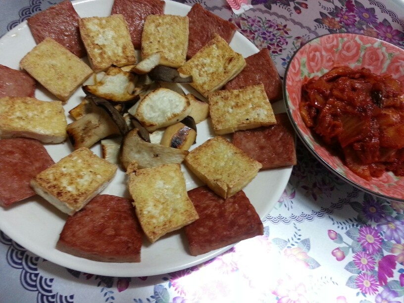 낮잠 푸짐하게 잔 죄로ㅎㅎㅎ 스팸이랑 두부랑 새송이꾸워서 주안상 차림요ㅎㅎㅎ 김치볶음은 당연하고ㅋ저는...점심때 배가 안꺼져서 물미역무침한 양푼에 밥비비고...육수진~~~한 김콩국 떠먹어요~