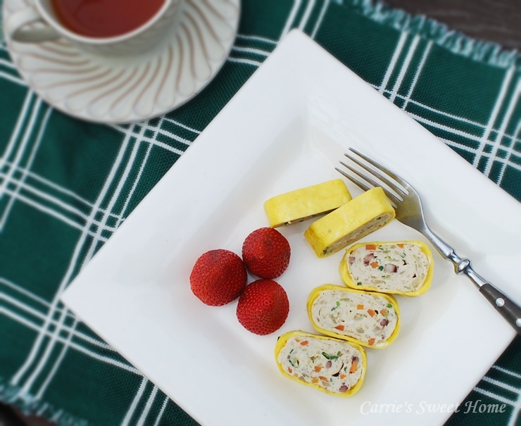 계란흰자에 원하는 재료넣어 섞어서 계란말이 해 준다음 노른자를 이어서 부어가며 감싸주었어요.^^