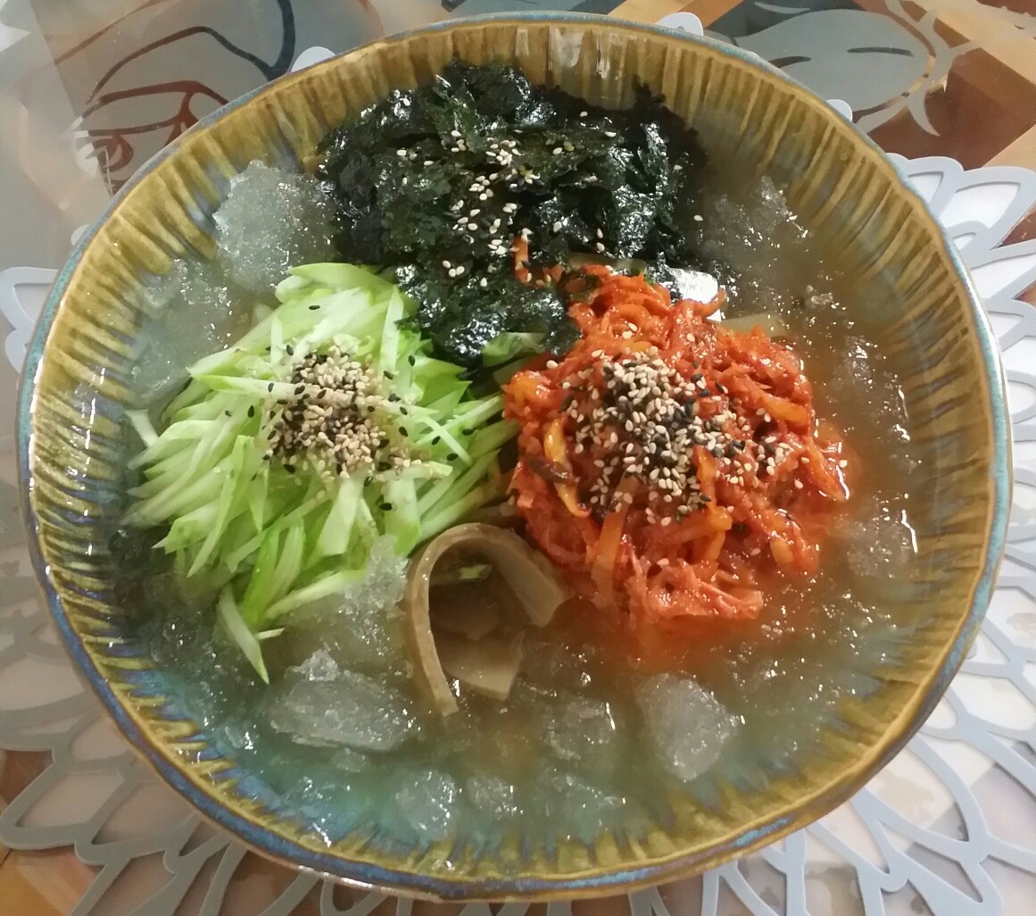 잘지내지? 비법이랄것두 없는데...시판냉면육수로 하는거라...육수에 설탕,식초 입맛에 맞게 추가하고 익은김치에 설탕,들기름 넣고 무치면 끝~~볼에 묵이랑 야채,무친김치,김등등 넣고 육수만 부어서 먹으면돼~~여름이면 늘 시판육수 쟁여놓는다...반은 냉동실에 보관했다가 섞어쓰면 얼음이 녹아도 육수맛이 연해지지않아 좋아~~^^