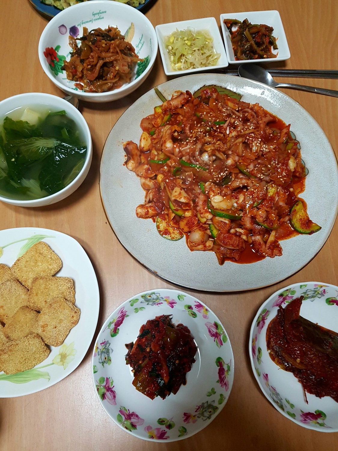 오늘은 쩡쑤기 생일전야제 ㅎ낙지뽁음 음청맵게 😈😈😈울 랑 똥꼬 빵꾸냔지두 몰라요 ㅎ내날잉께 내 식성대루 콧물흘리며 얌냠 쐬주둥 한병 ㅎ 일케 다리길게낳아주신 울엄니 고생하셨어요 ㅎ 생각이또 많아지네요 ㅎ굿밤요 😴😴😴