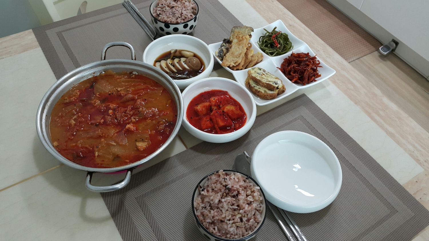 김치찌개재탕에 어제먹던것들해서 밥먹어요~😋😊