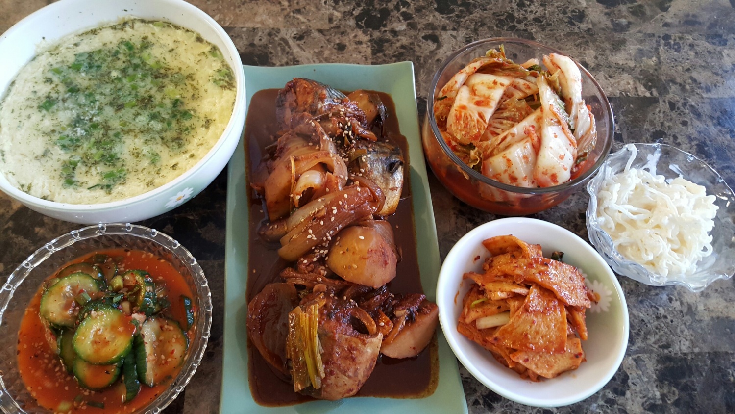 오늘 아침엔 살짝 미안한 맘에 미역국 끓이고 오뎅 맵게 볶구 계란찜해서 고등어 김치 넣고 지짐해서 아침 차려 놓구