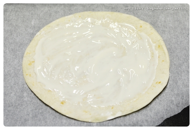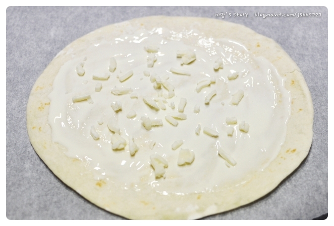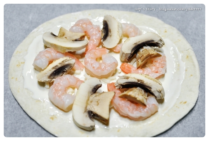 偶尔上传玉米饼披萨食谱的时候... "啊~~ 如果我有烤箱的话..." 有很多人这样说~ 放在平底锅上用小火烤也足够了^^ 但是... 今天使用像虾一样需要煮熟的材料时,提前煮熟后再放上去会更方便~ 如果想煮熟虾仁,墨西哥卷饼可能会烤焦。+_+;