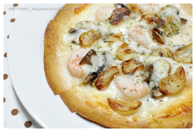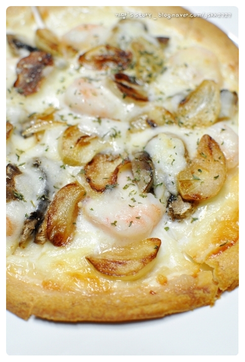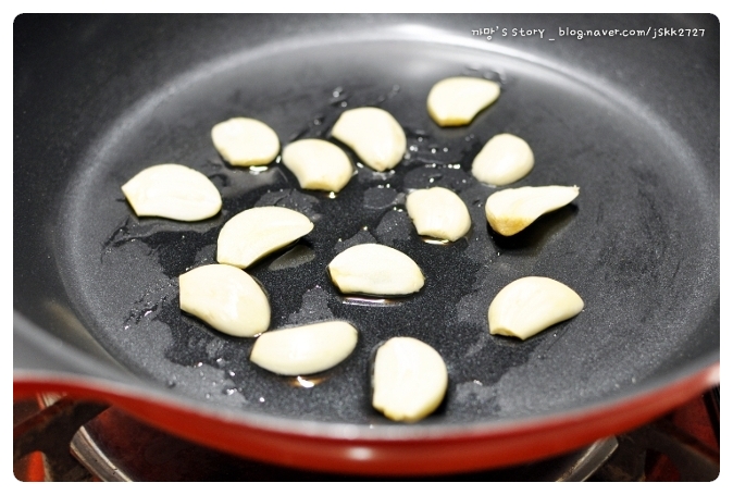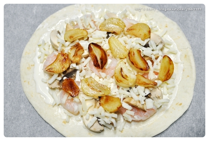 在上面均匀地撒上马苏里拉奶酪,然后放上炒好的大蒜即可。 在预热至200℃的烤箱中烤12-15分钟左右。 这时马苏里拉奶酪比起从冷冻室刚拿出来的冰冻状态的奶酪,使用在室温下充分解冻的奶酪是让人感受到拉丝奶酪味道的秘诀。^^