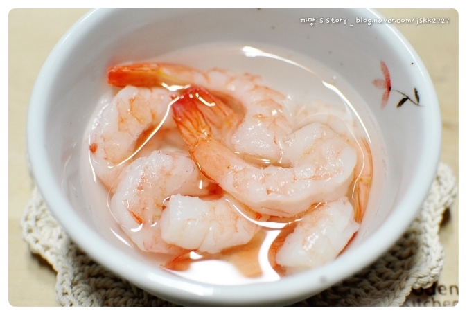将去皮处理后的虾放入料酒(or 吃剩的烧酒)中浸泡10分钟左右,去除腥味。