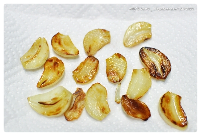 炒至金黄的大蒜请在厨房毛巾或油纸上倒入油备用。
